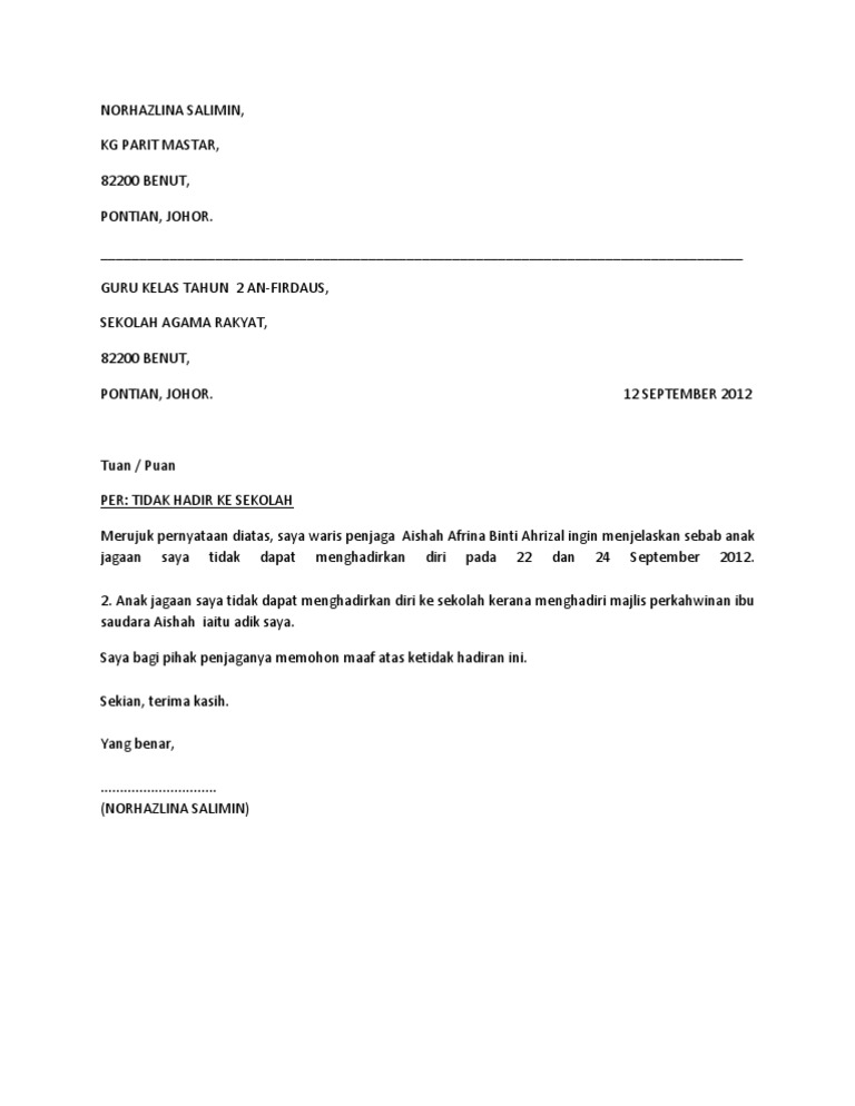 Contoh Surat Tidak Hadir Ke Sekolah Otosection